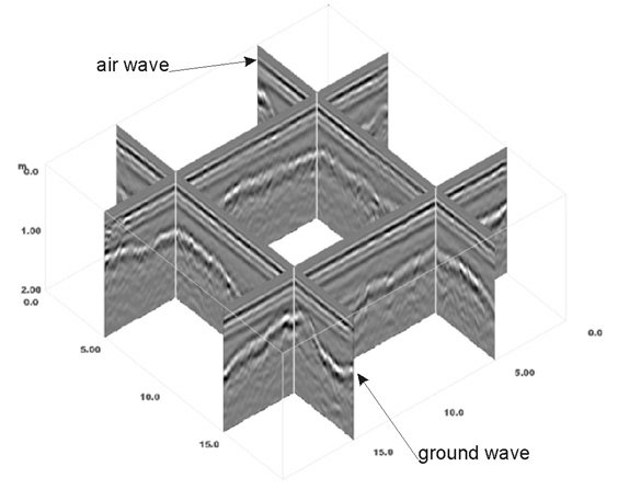 - Strukturerkundung: Anhand von reflektierten, diffraktierten und refraktierten Wellen im Radargramm lässt sich die Lage und räumliche Ausdehnung von Schichtgrenzen (z.B. Grundwasserkörper).